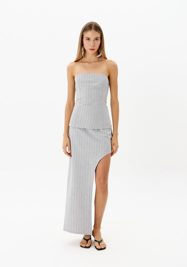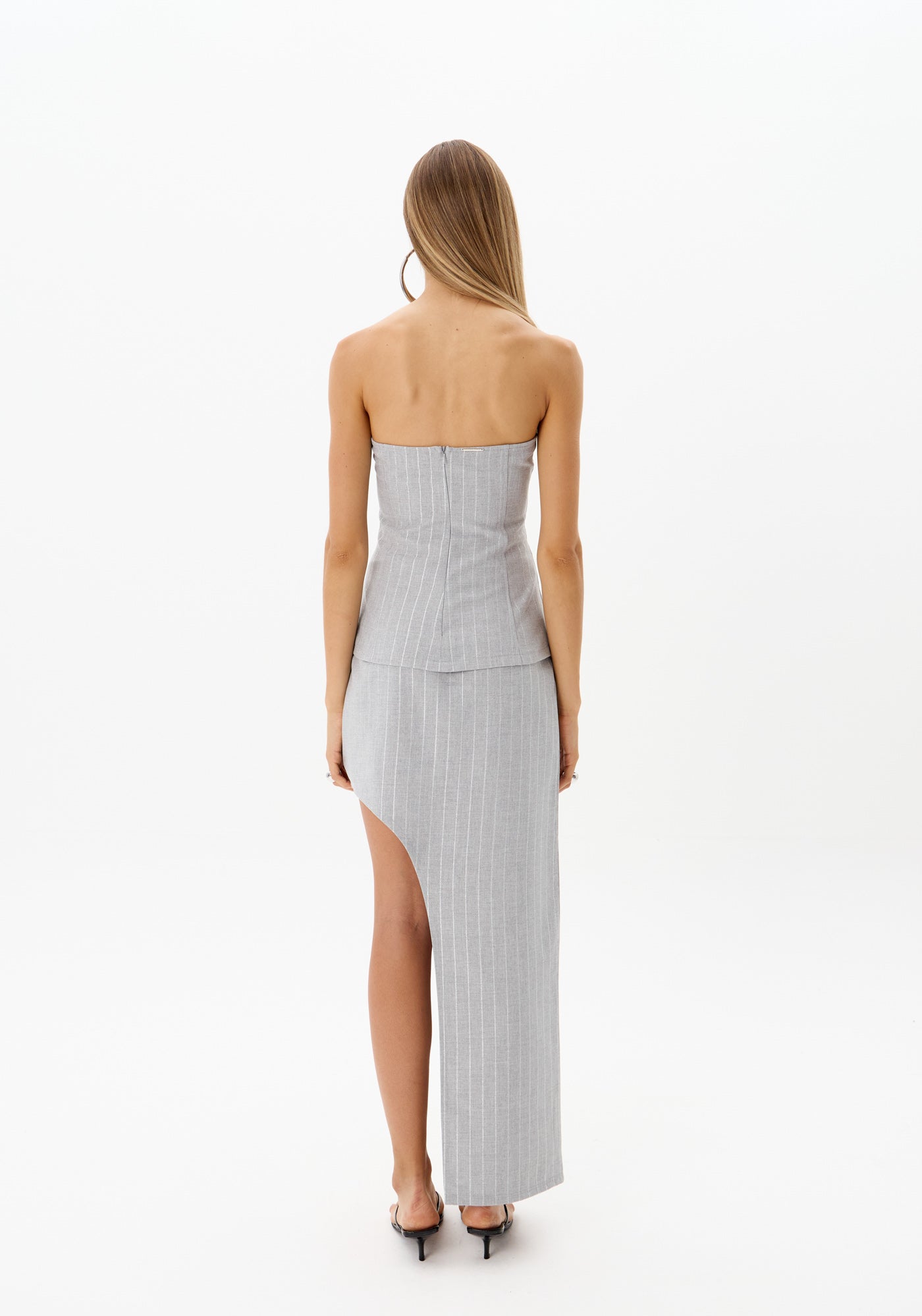 A blusa com modelagem corset e comprimento alongado é um clássico repaginado. A peça conta com caimento justo, design sem alças que valoriza o colo e fechamento por zíper que garante praticidade. a padronagem risca de giz traz aquele toque cool direto do office pro look do dia ou da noite.