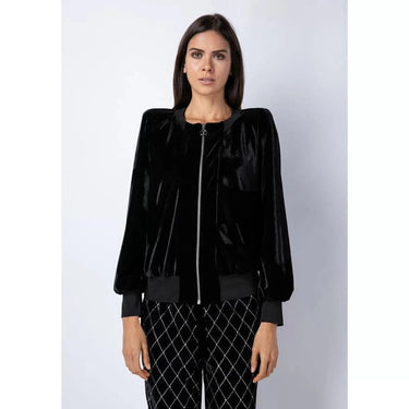 Jaqueta bomber, com zíper, de veludo, com detalhes brilhantes nas costas.