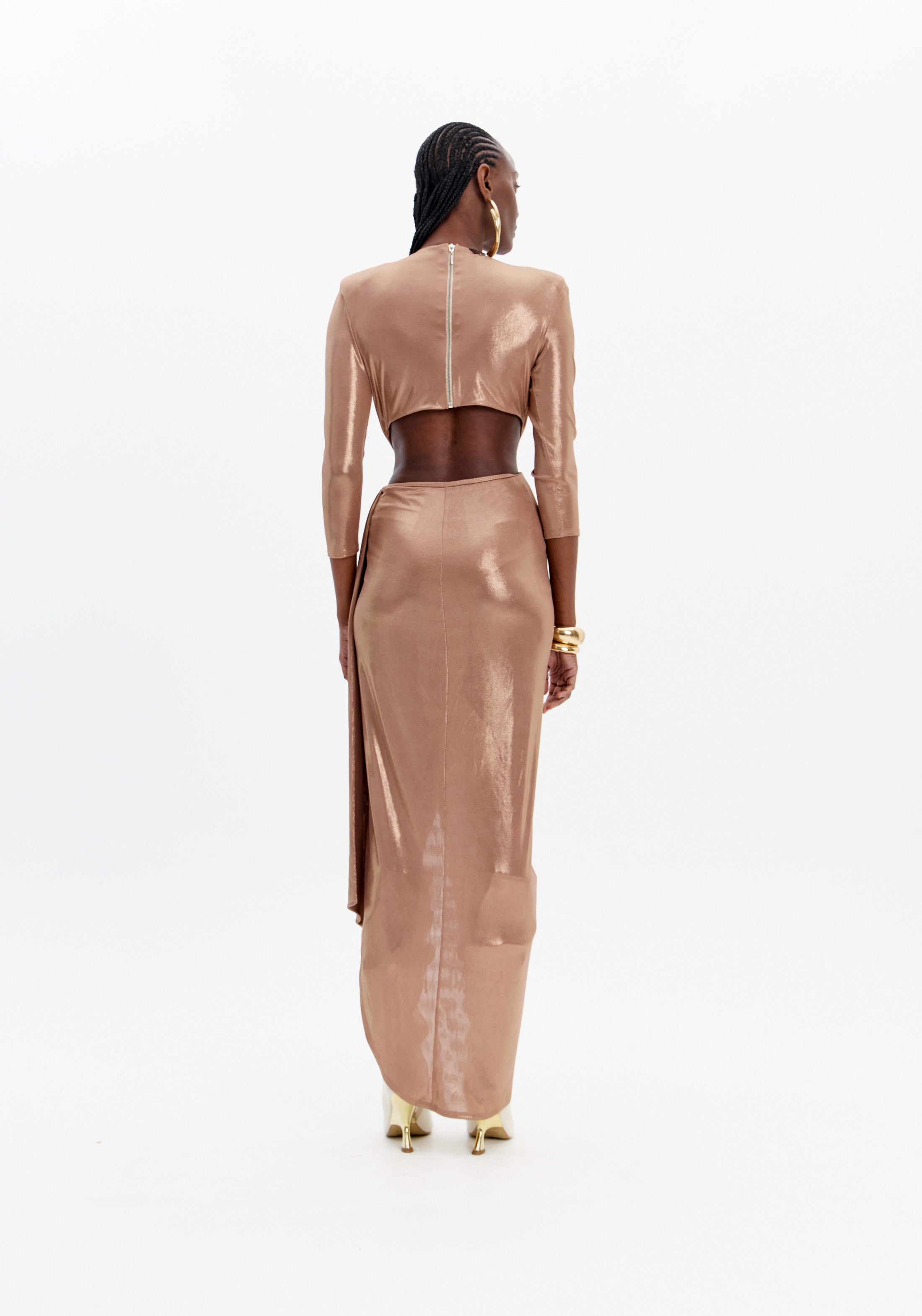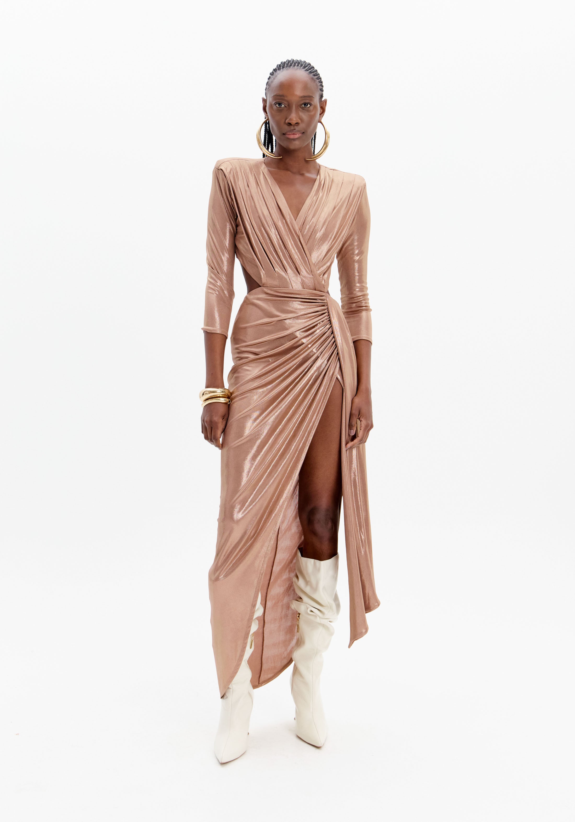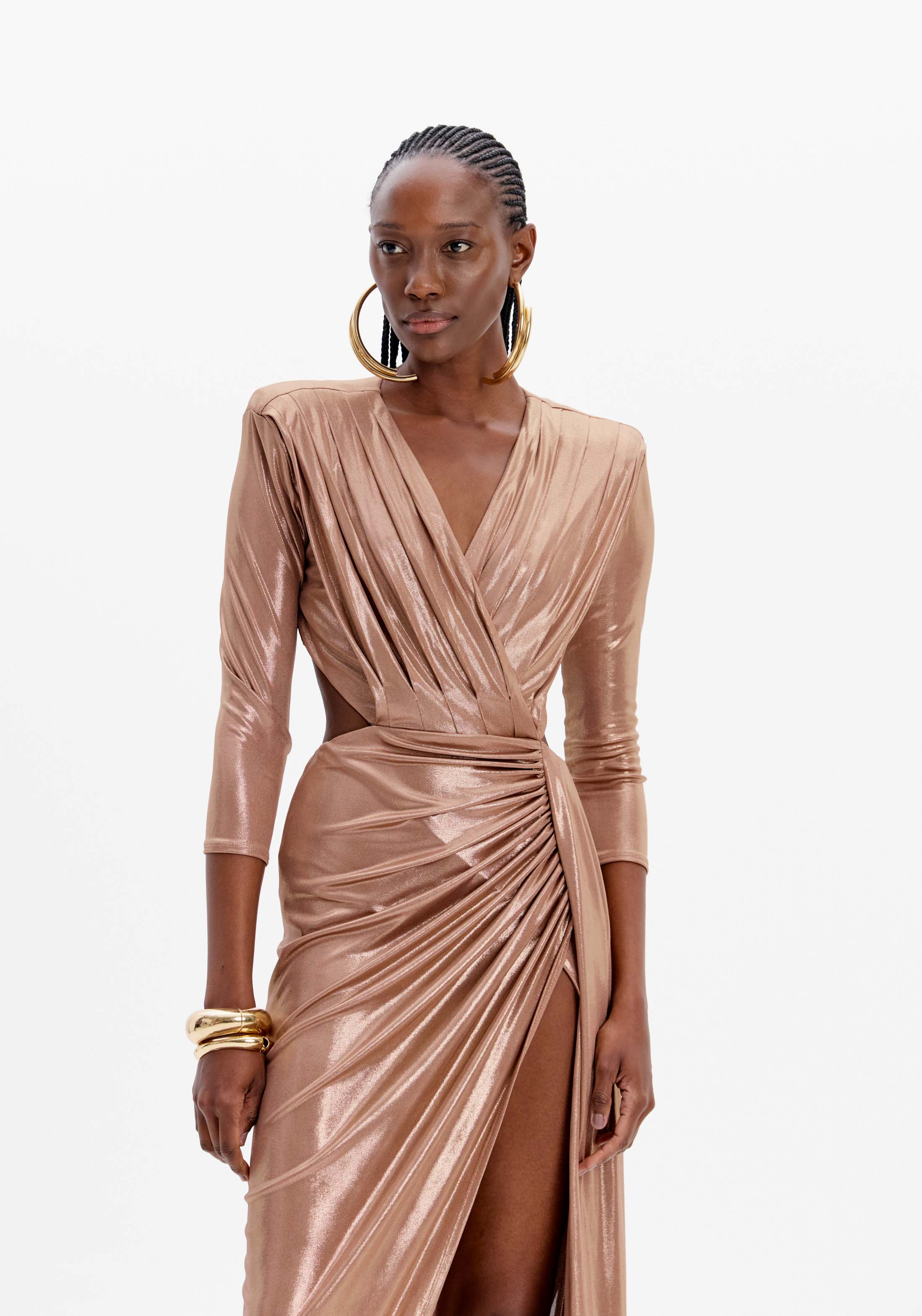 Ousado, este vestido super midi com modelagem drapeada possui mangas médias, decote em v efechamento posterior por zíper. A fenda lateral adiciona o detalhe perfeito para quem busca estilo esofisticação.