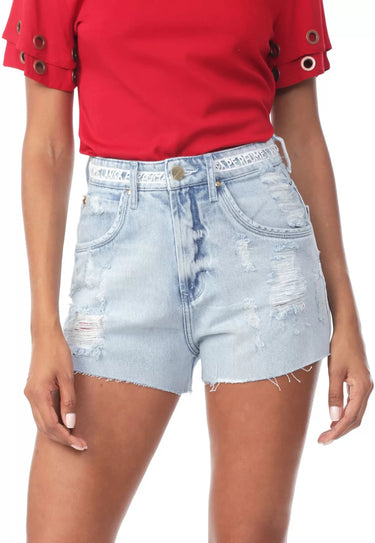 Shorts de cos alto no jeans claro e detalhe de metal dagrife