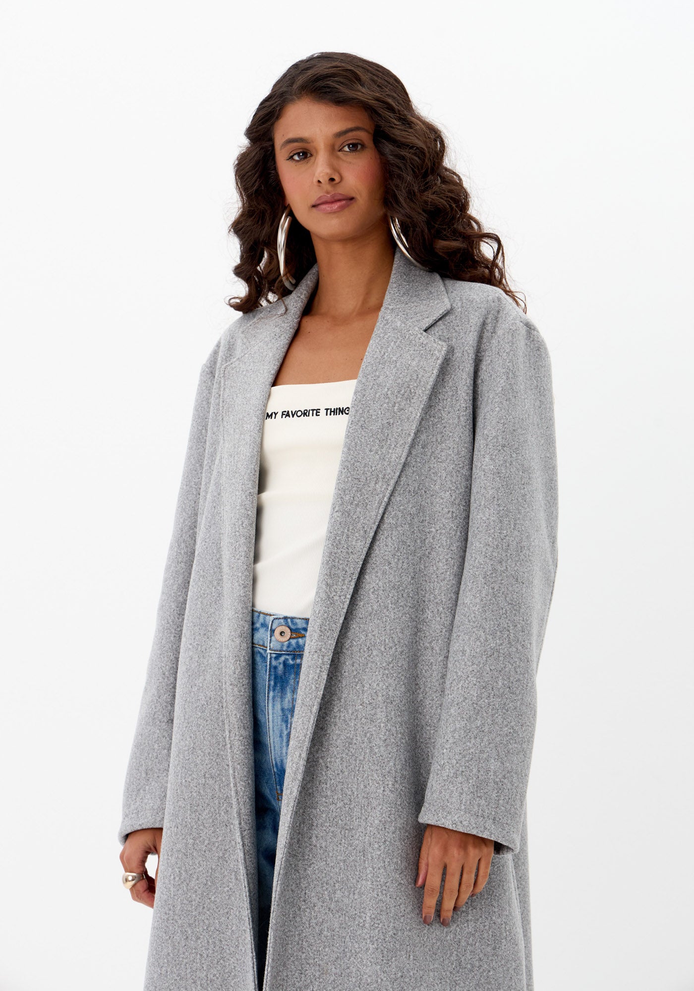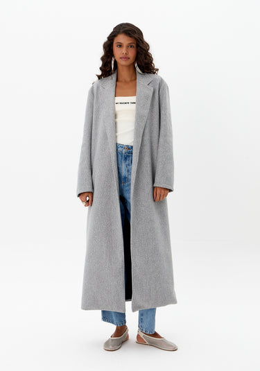 De comprimento alongado, modelagem ampla e textura encorpada, entrega um visual urbano, elegante e atemporal.