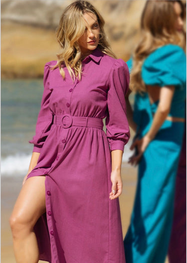 Elegance meets practicality in the SX05 - Sax midi dress, with its button-down design and sash, creating a modern and sophisticated look. Enhance your beauty and stand out with this unique design!