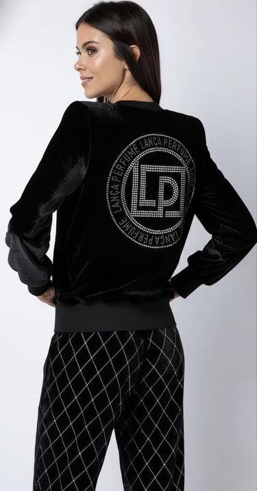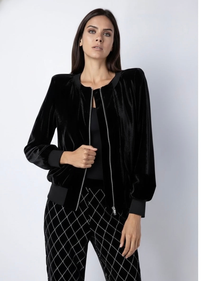 ジッパー付きベルベットボンバージャケット。背面に光沢のあるディテールが施されています。