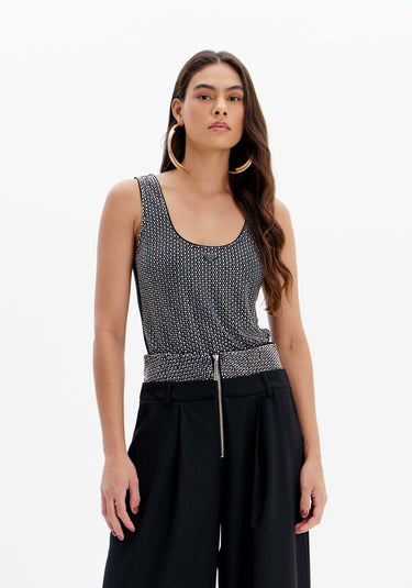 A blusa regata com alças largas e decote em u é confeccionada em malha de caimento confortável. As aplicações de brilhos na parte frontal trazem brilho e um charme especial para as suas produções noturnas.