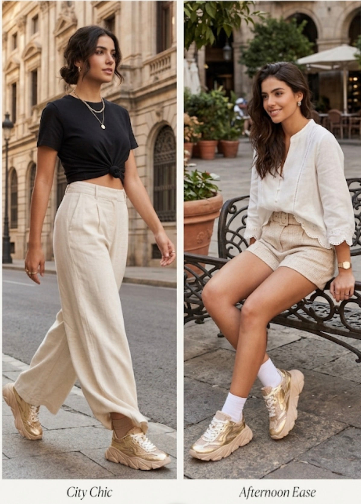Tênis nas cores dourada e bege.